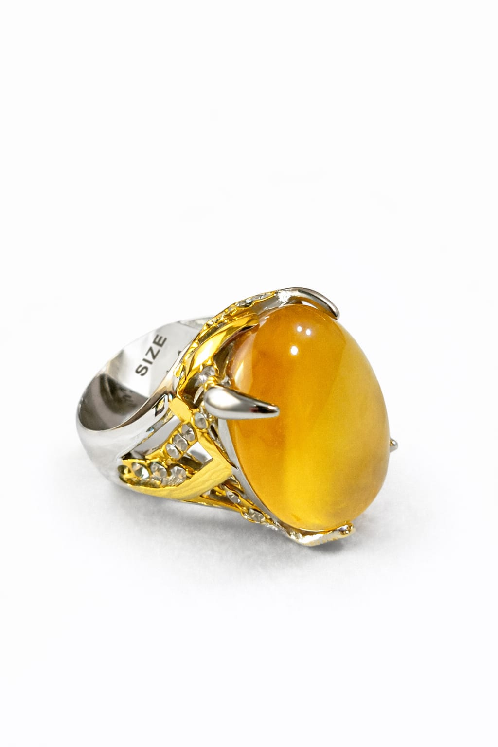 A stylish men’s ring with a glowing amber-yellow oval stone and elegant gold side frame. Ideal for fashion and traditional wear.