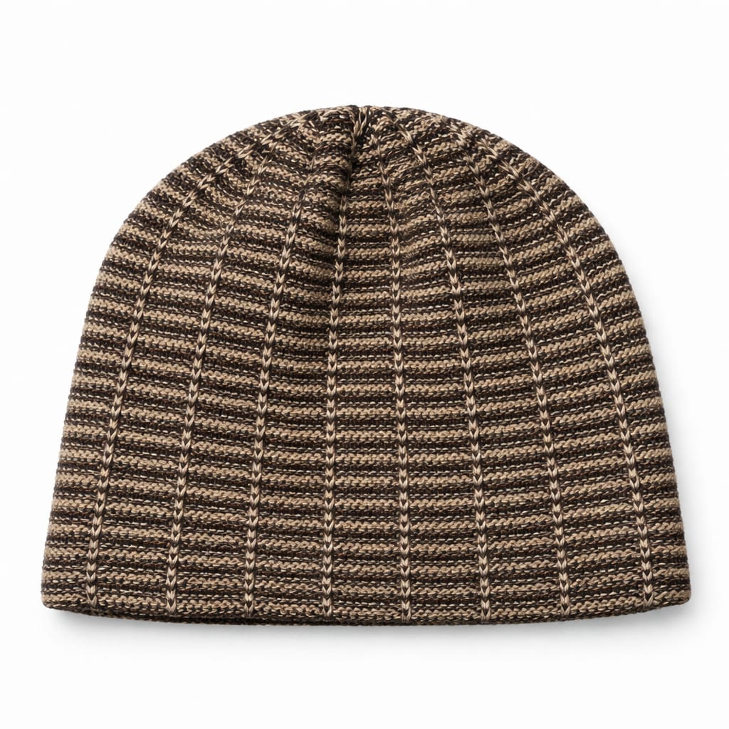This brown textured knit beanie features a unique woven pattern that adds depth and style. Designed for comfort and warmth, it’s perfect for winter wear.