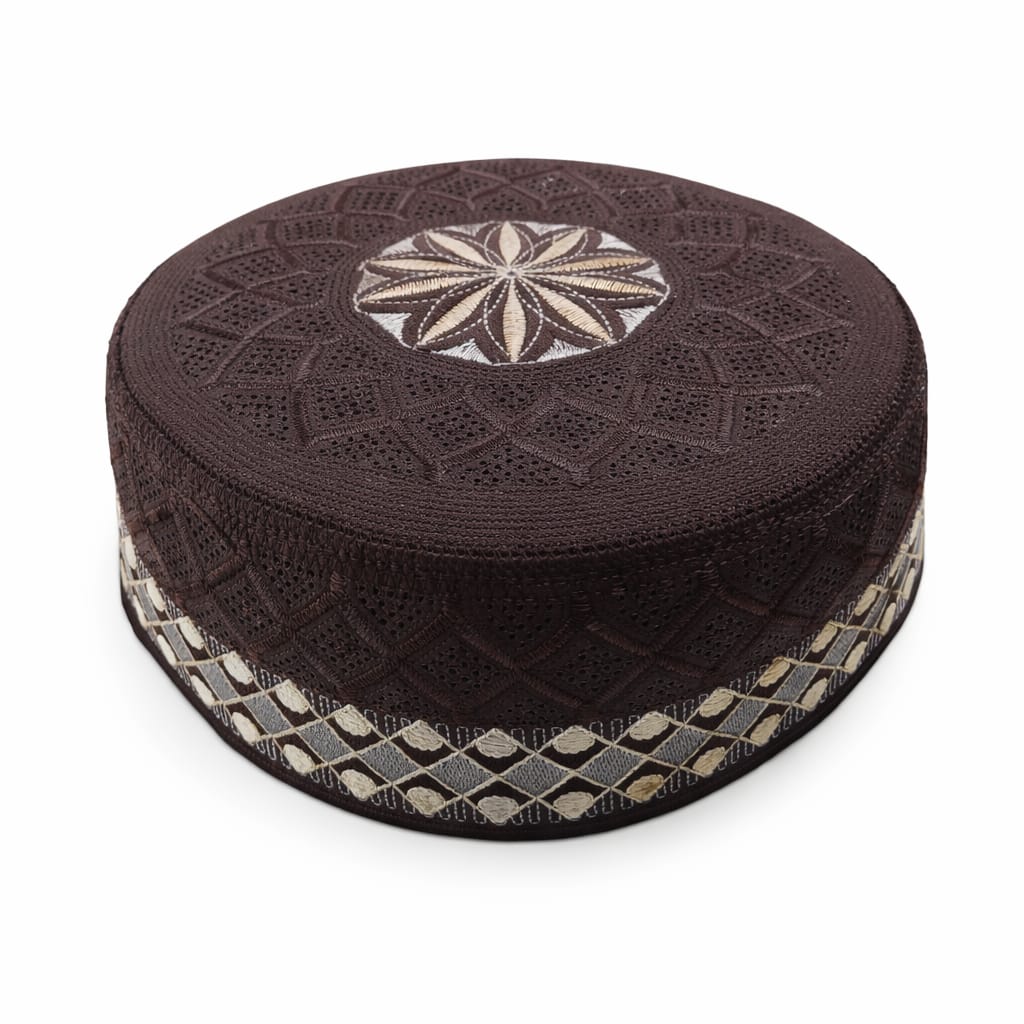 This dark brown Islamic kufi cap showcases an elegant white geometric embroidery pattern that reflects traditional Muslim craftsmanship. The balanced design adds a refined and modest appearance suitable for both daily prayers and formal Islamic gatherings.