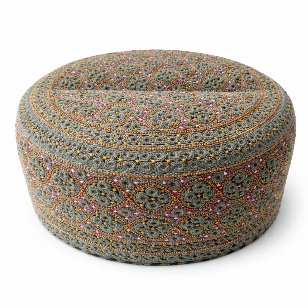 The Handmade Sindhi Grey Embroidered Round Prayer Cap features traditional Sindhi craftsmanship with detailed embroidery. This beautifully handcrafted cap is designed for comfort and style, making it perfect for daily prayers and religious gatherings.