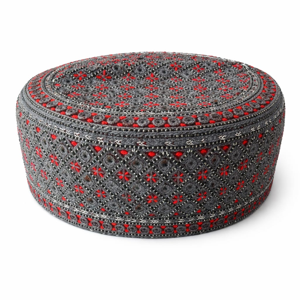 The Handmade Sindhi Grey Red Embroidered Round Prayer Cap showcases a unique combination of traditional Sindhi embroidery and modern design, making it a stylish and comfortable Islamic cap.