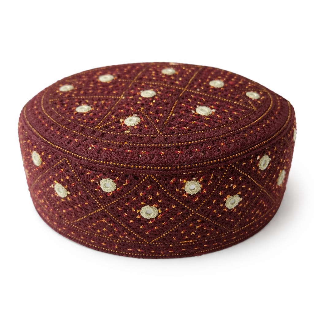 This Handmade Sindhi Maroon Mirror Embroidered Prayer Cap features unique mirror style embroidery inspired by traditional Sindhi craftsmanship.