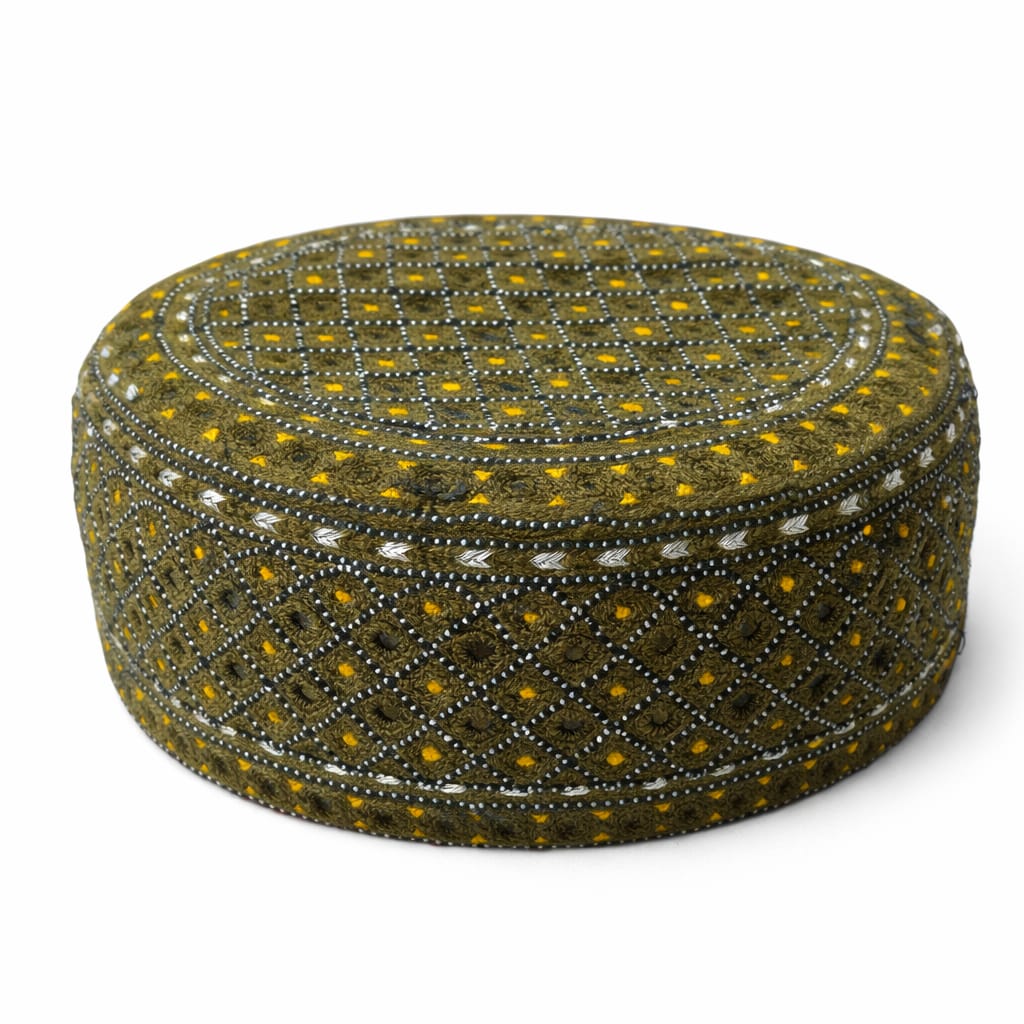 The Handmade Sindhi Olive Yellow Embroidered Prayer Cap combines beautiful traditional Sindhi embroidery with a comfortable and stylish round cap design.
