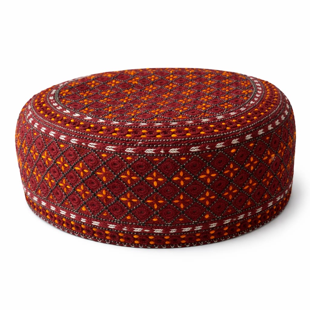 The Handmade Sindhi Red Orange Embroidered Round Prayer Cap highlights vibrant traditional Sindhi embroidery with a beautiful cultural pattern.
