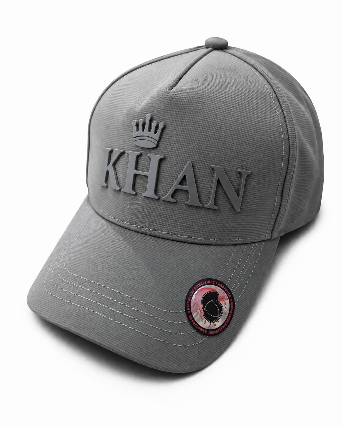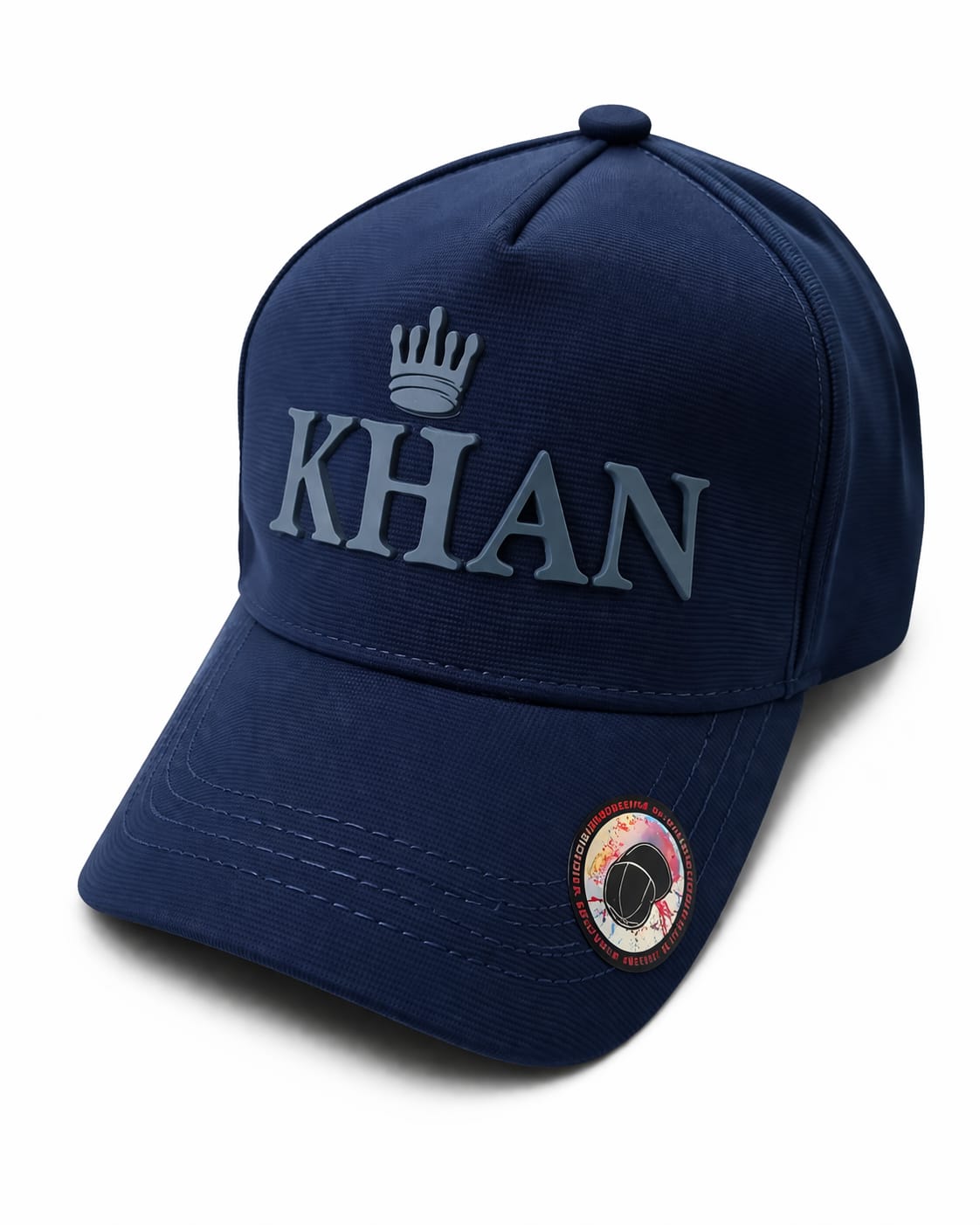 Elegant navy blue cap featuring embossed KHAN branding with crown logo.