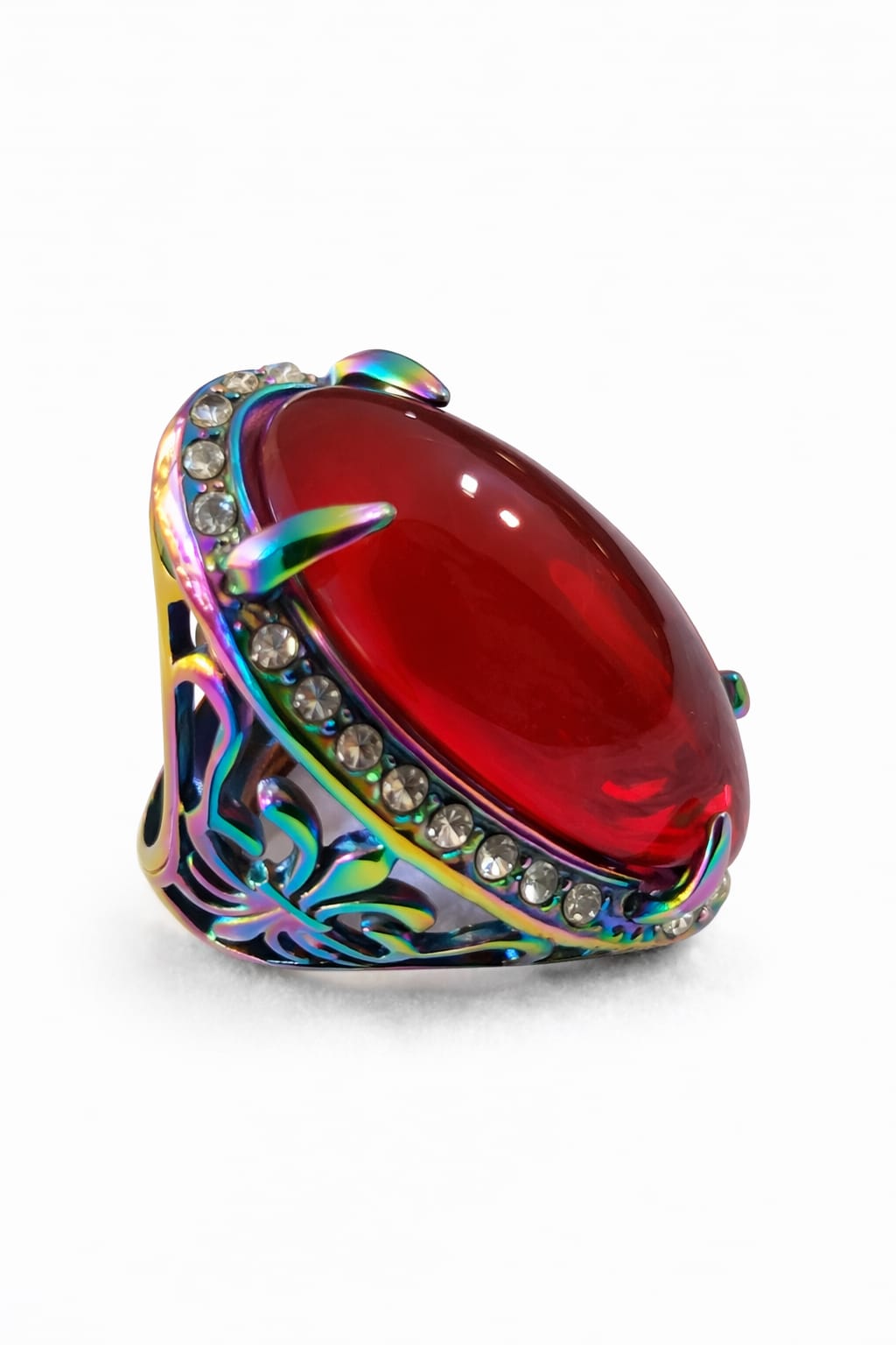 This is a premium designer-style ring featuring a bold red oval crystal stone with a rainbow metallic finish frame and crystal side detailing. Ideal for users who want a unique fashion statement.