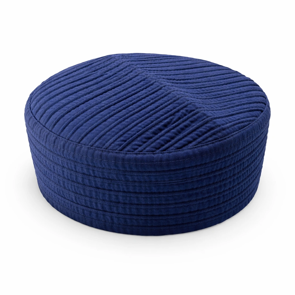 This pleated navy blue Muslim prayer cap features layered stitching that creates a stylish and modern look. The elegant pleated design gives this Islamic kufi cap a distinctive appearance.