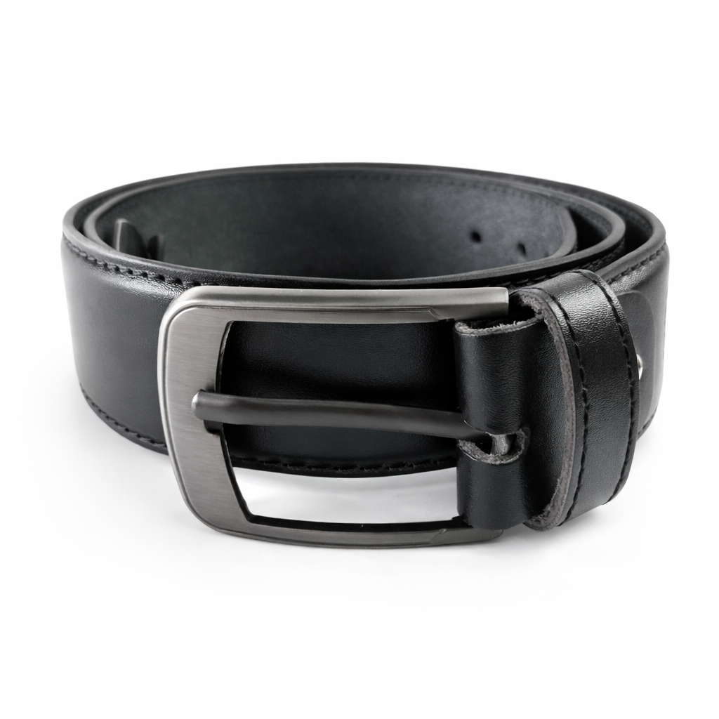 Elegant black leather belt featuring a smooth finish and modern matte metal buckle. Perfect for office wear, business attire, and formal occasions, providing a clean and sophisticated look with long-lasting durability.