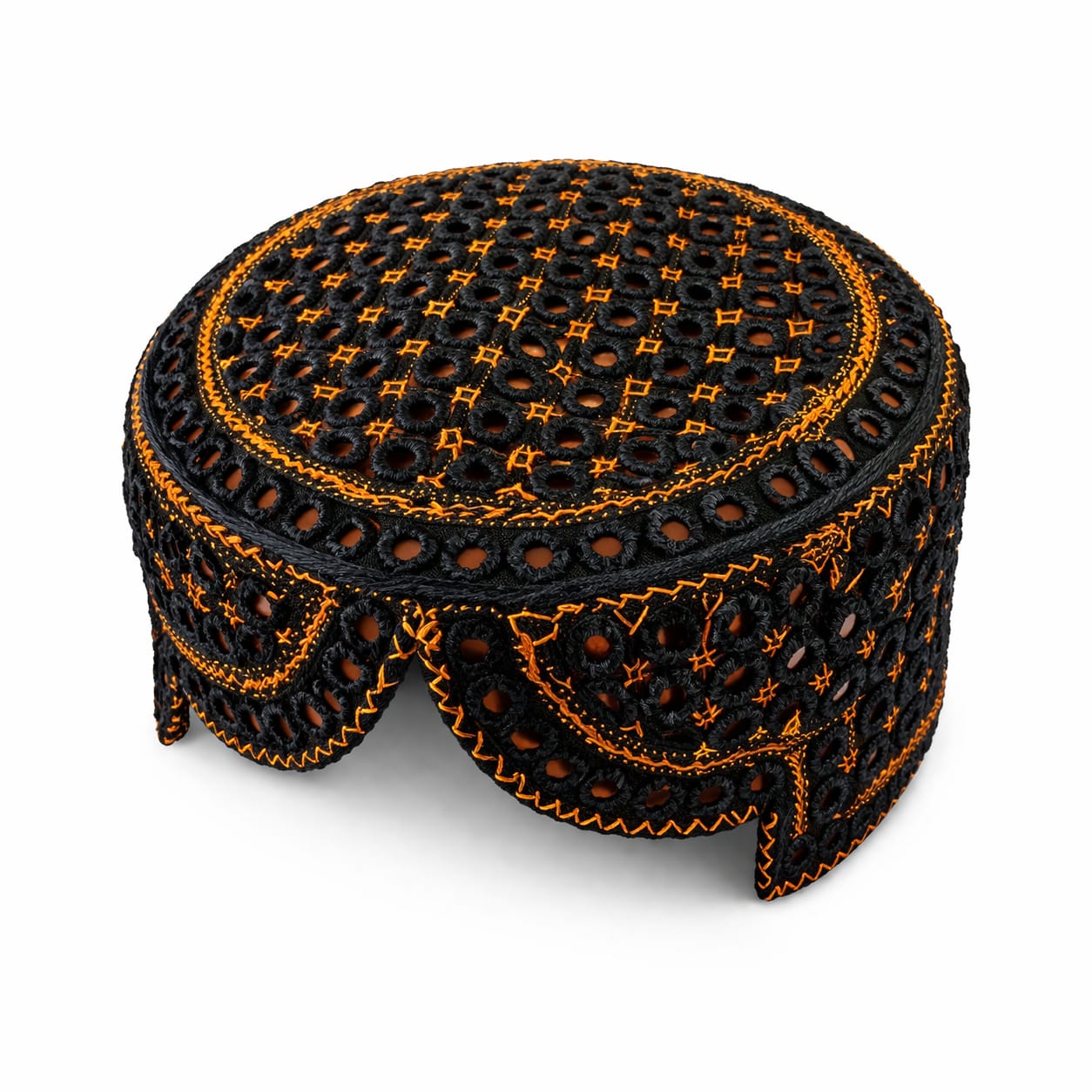 Honor tradition with this premium handmade Sindhi cap, beautifully crafted in a classic round topi style with elegant black and orange thread embroidery. This cap showcases authentic Sindhi craftsmanship through its intricate handwork, detailed cutwork pattern, and traditional circular design.