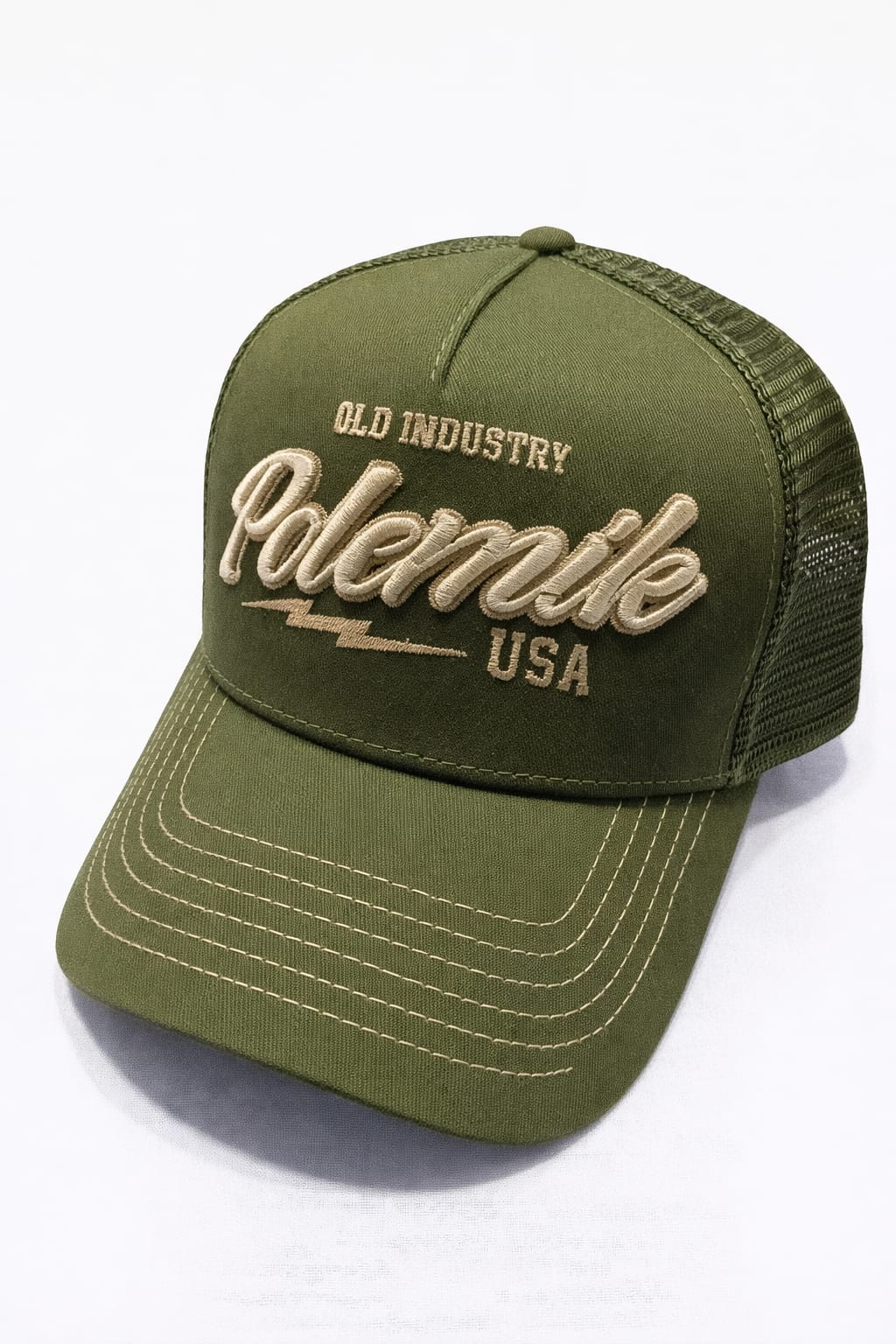 A premium olive green trucker cap with stylish embroidery and breathable mesh back, perfect for casual and outdoor fashion.