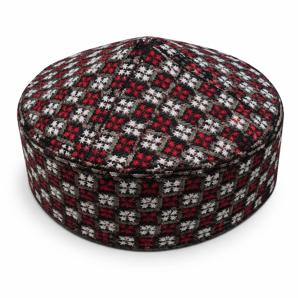 This traditional kufi cap features a bold red, black, and white embroidered pattern that reflects authentic Islamic craftsmanship. The detailed design adds character and cultural heritage to your Islamic attire.