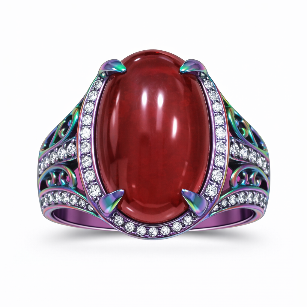 Luxury red stone ring featuring an artistic multicolor metal frame, combining modern design with traditional elegance.